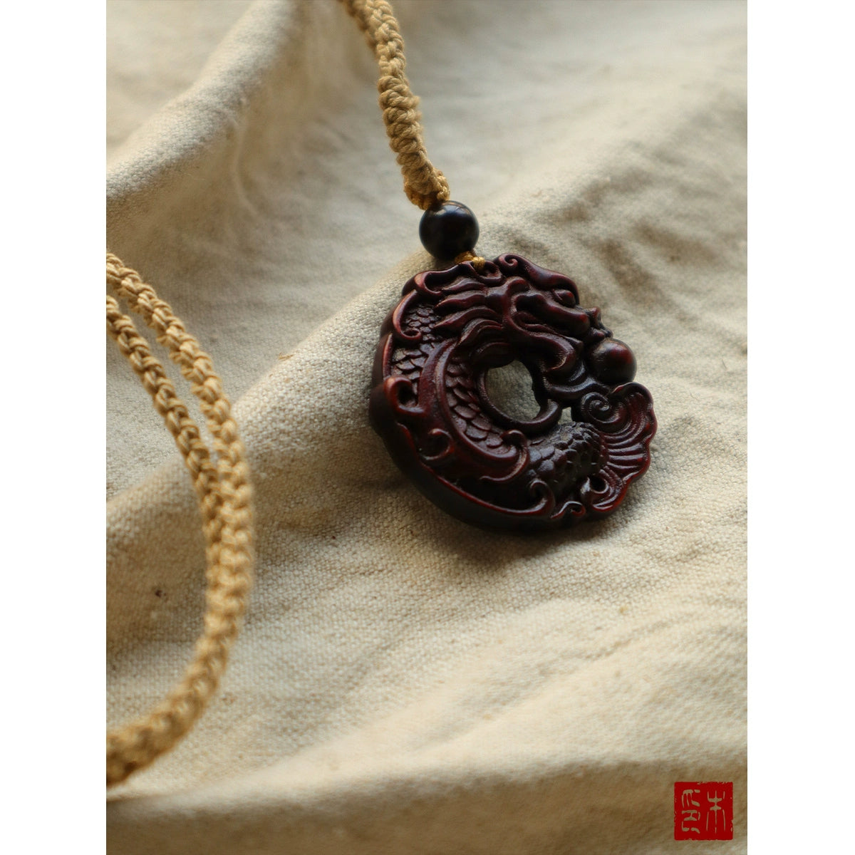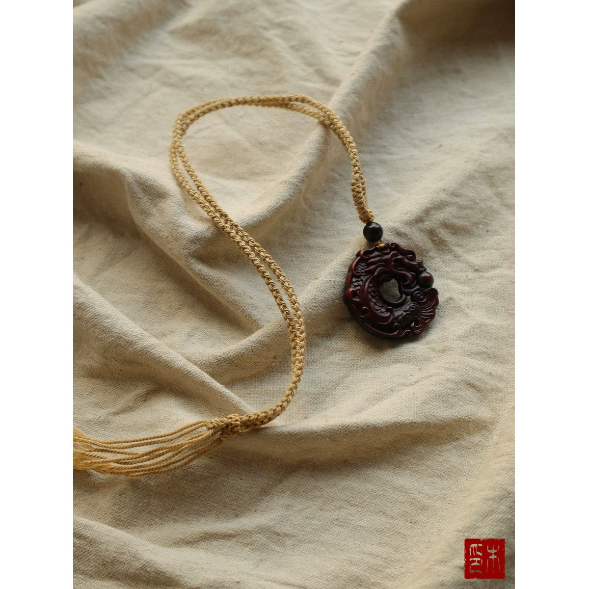"Scale Carp" Sandalwood Carving Arowana Safety Buckle Pendant Handmade Braided Rope Chinese Zen Pendant Necklace